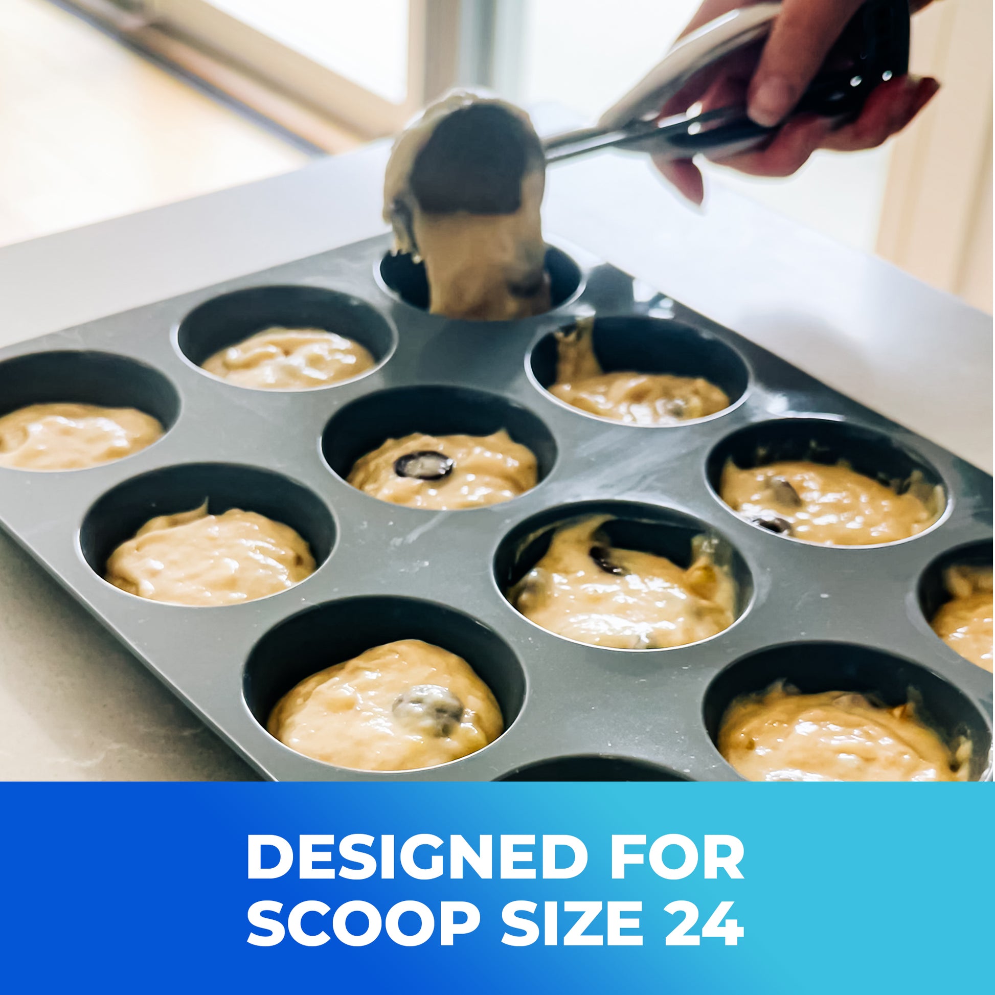 - SIZED FOR JENALUCA LARGE SCOOP: The 12 cup regular size silicone muffin pan matches size Large Jenaluca scoops for mess-free baking of cupcakes, muffins and more. It matches a disher scoop #24 which is 3 tablespoons / 1.5 ounces.